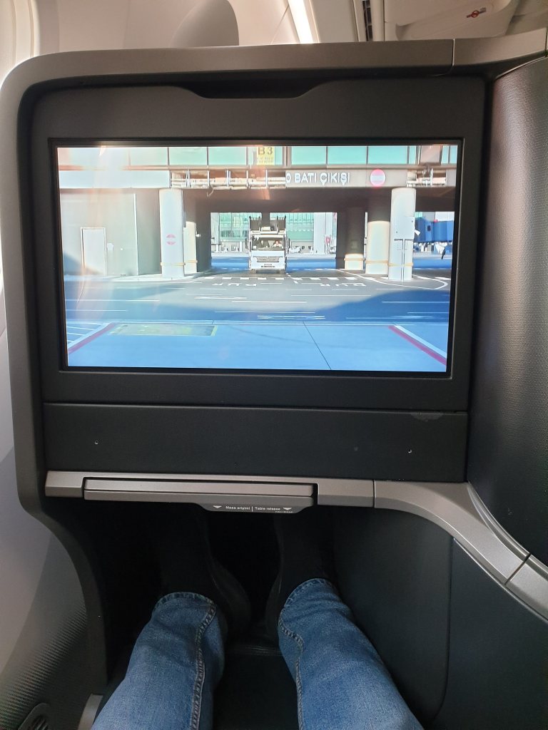 I arrived at my seat. The seat number was 2A so it’s in the 2nd row. Business Class seat configuration on this Turkish Airlines B787 plane is 1-2-1. There are 8 rows and a total number of 30 seats in the business class cabin (only 2 seats in the last row). The seat felt like a semi private suite. I understand that it’s not as private as Qsuite in Qatar Airways but it still provides a high level of privacy. The seat turns into a flat bed, there are multiple storage spaces, dedicated air vents to control temperature, and an 18 inch touch screen (it was huge).