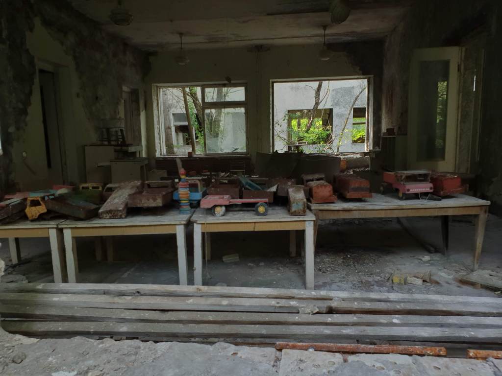 After the visit to the impressive Olympic-size swimming pool, we walked around the kindergarten. Note that these haunting pictures are artificial as these dolls were brought by stalkers (A group known to sneak into Chernobyl illegally to explore abandoned buildings). What these stalkers do is extremely dangerous but it is what it is.