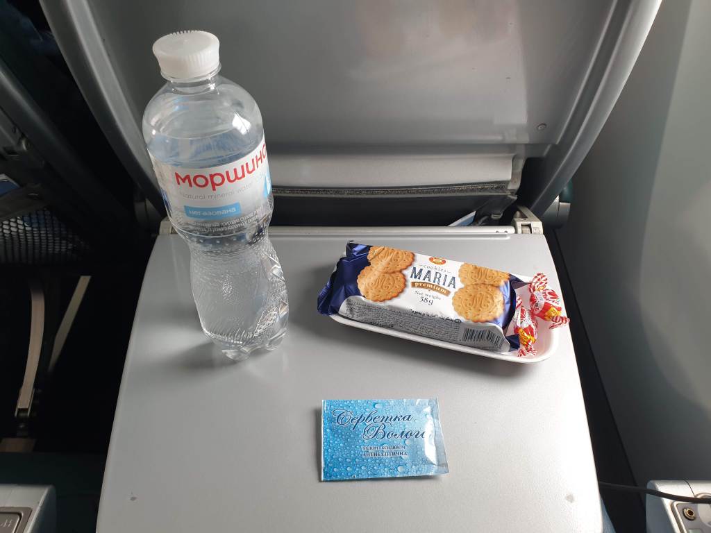 A few minutes after take-off in this 1 hour 15 minutes domestic flight, service started and the flight attendant served passengers a bottle of water, pack of biscuits, and sweets. I must admit that this is not the best service I’ve ever had but I must say that it actually exceeded my expectations. Those who follow me on instagram saw what Austrian Airlines served us on a 2-hour international flight between Kiev and Vienna; a tiny piece of chocolate! At least the Ukrainians served me a pack of tasty biscuits and some sweets! The taste of this Maria biscuit reminded me of my childhood in Kuwait so I just loved every bite of it. This domestic Ukrainian airline MotorSich truly exceeded my expectations so I would highly recommend them if you want to fly domestically in Ukraine.