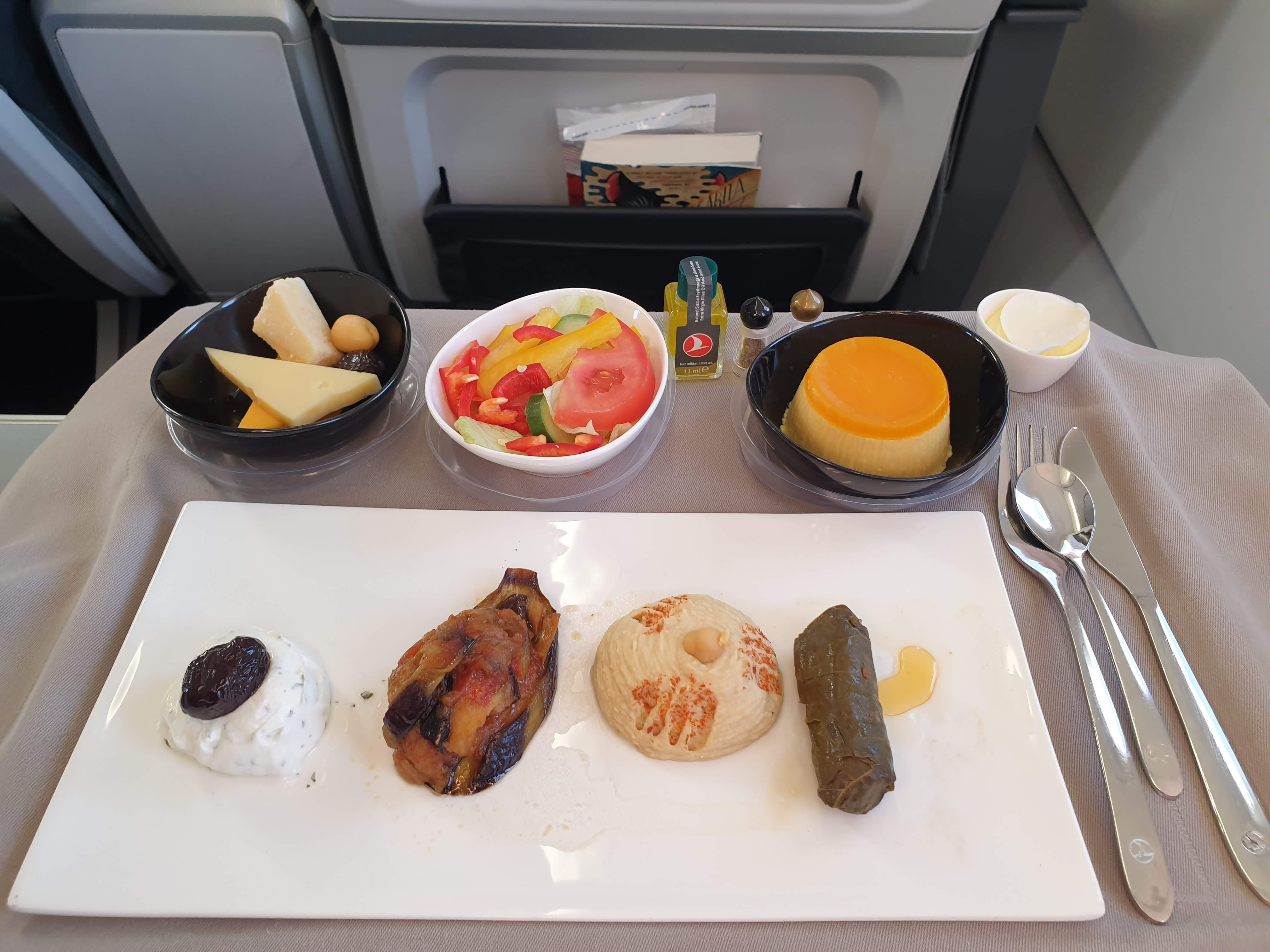 A few minutes later, it was time to serve the first course of dinner; the presentation was spectacular especially with the tiny Turkish Airlines salt and pepper mills. The main appetizer dish in the tray had 4 tasty appetizers; grape leaf, hummus, eggplant, and Haydari (Turkish yogurt dip). The tray also had a small dish of cheese selection, a salad, a freshly baked bread, and a truly delicious mango panna cotta. Everything tasted exactly like how it should taste in a fancy restaurant and everything looked fresh and tasted fresh. I made sure to finish the appetizer dish first and then a moment later, the main dish arrived to occupy the place of the appetizer on the tray.