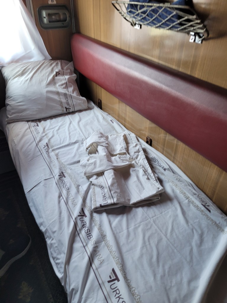 I boarded the train, and I easily found my compartment. A compartment in Soviet/Russian style trains is known as Купе (pronounced Kupe). The train that took me to Karaganda was a Soviet-era train that was built in the 1980s. Only two classes were available on this train; Platzkart (Плацкарт) and Kupe (Купе).