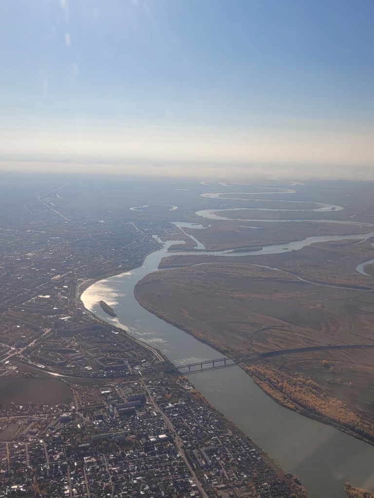 on a beautiful autumn day, I took an early morning short flight from Astana to Pavlodar. I was flying with a Kazakh Airlines company called SCAT for the first time. I heard many negative things about SCAT particularly how bad their reputation was especially after they were banned from entering European airspace due to safety concerns. However, their reputation improved a lot since the ban was lifted in 2018 and I would say that I had a very nice experience flying with them. The plane was about 30 years old but the flight was short and pleasant; it was on time, the legroom was spacious, and they even provided a free bottle of water. All in all, I had no reason not to like them! The view I had from the window was breathtaking. I was lucky to experience this flight on a warm and sunny autumn day. By the way, I paid $22 USD for the flight and that included one piece of luggage. Amazing deal, right?