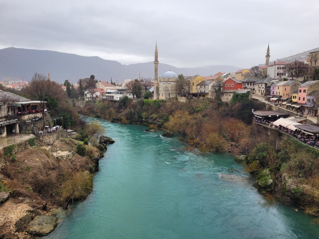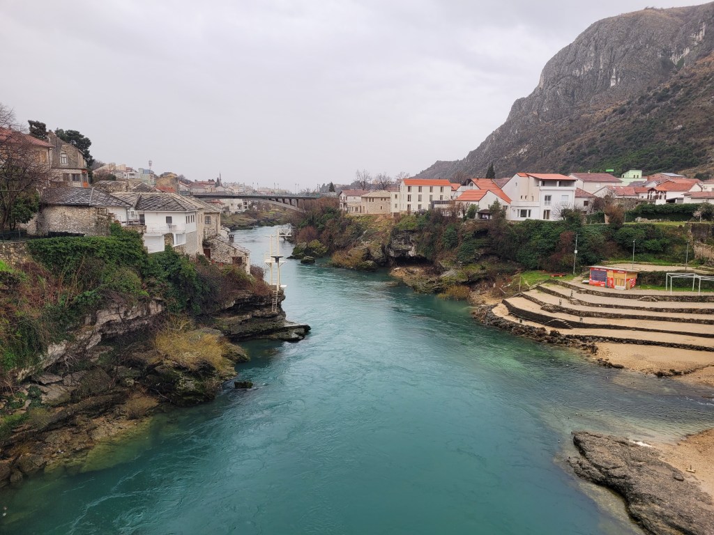 Locals and visitors often describe the region around Mostar in Bosnia & Herzegovina, Croatia, and Montenegro as a piece of heaven. The nature and culture there are incredibly beautiful, making it an ideal holiday destination, especially in the sunny summer months. There were some drawbacks to visiting this magnificent place on a rainy February day, but the advantage was that it was less crowded. I heard from someone I had a chat with that in the summer, the place could be so packed that it’s not possible to walk on the bridge. So, basically, I had the whole place to myself despite the bad weather.