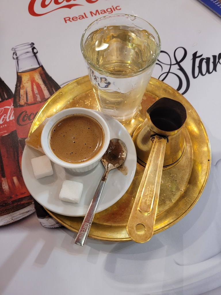 I crossed the bridge back and forth multiple times, capturing some photos and taking my time to admire its beauty, despite the rain. Right after crossing the bridge, I found a charming café where I enjoyed a tasty Bosnian coffee. However, I’ll provide more details about that experience in the food section below.