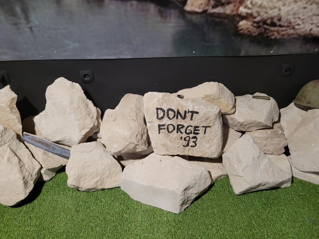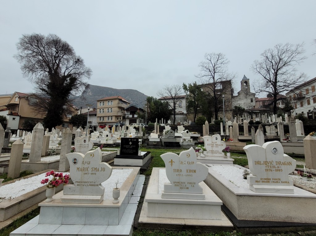 I found a bakery so I ordered and quickly ate a meat Burek there and then I made a stop in a cafe for a morning Bosnian coffee oh and as usual, cash only! I continued my walk and found a beautiful mosque, in the mosque’s yard, there’s a cemetery with all the graves having the same year of death (1993). I recall reading that the people in Sarajevo, Mostar, and some other Bosnian cities had to bury their deceased in these yards because other bigger cemeteries were exposed to snipers. This illustrates a very sad and difficult history of these Bosnian cities.
