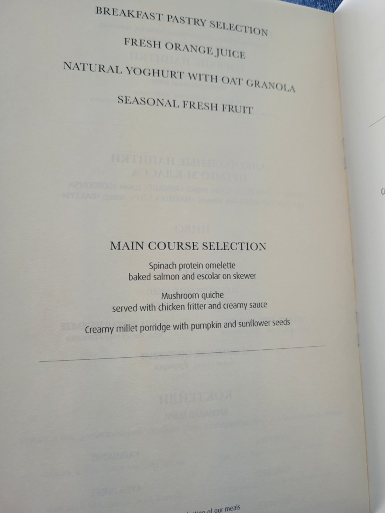 The service started with serving welcome drinks. I opted for cherry juice. I love cherry juice on Air Astana flights and I even had another one. Shortly after, the cabin crew began handing out the menus. There are three options for the main course: a Spanish omelette with baked salmon and escolar on skewers, mushroom quiche, and creamy millet porridge. I chose a Spanish omelette. Later, the cabin crew handed out blankets and the safety videos started to play for take-off.